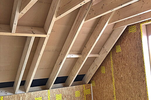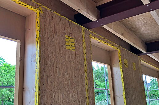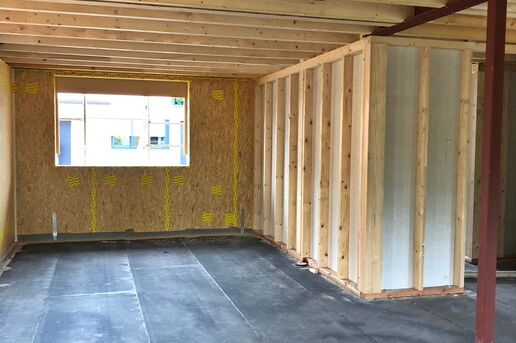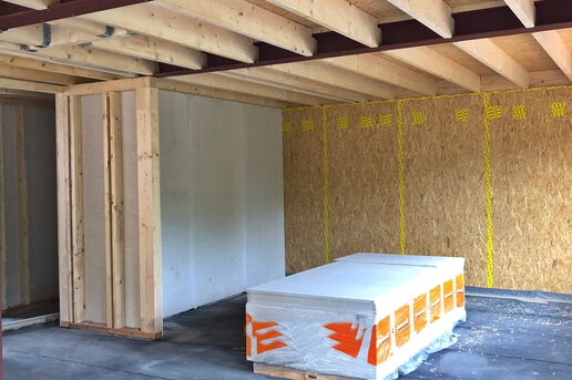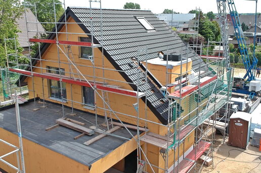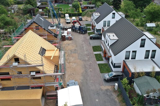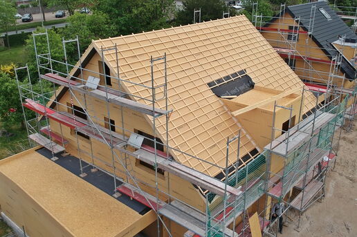 In diesem Baugebiet werden von uns ausschließlich Häuser in ökologischer Holzrahmenbauweise erstellt. Mittlerweile ist das vierte der insgesamt fünf Ein- und Mehrfamilienhäuser aufgestellt.