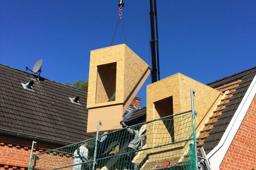 Ein immer interessanter werdendes Thema ist die Altbausanierung und die Wohnraumerweiterung im Bestand. In dem vorher mit modernster 3D Technik aufgenommen Bestand wird die Baumaßnahme präzise geplant, konstruiert und mit dem Kunden abgestimmt. Anschließend werden Wände, Decken oder ganze Dachgauben in der Produktionshalle vorproduziert und dann auf der Baustelle schnell, störungsarm und sicher verbaut. Hierbei ist der eigene Autokran ein sehr willkommenes Hilfsmittel und sorgt in der Planung für ein Stück mehr Flexibilität.