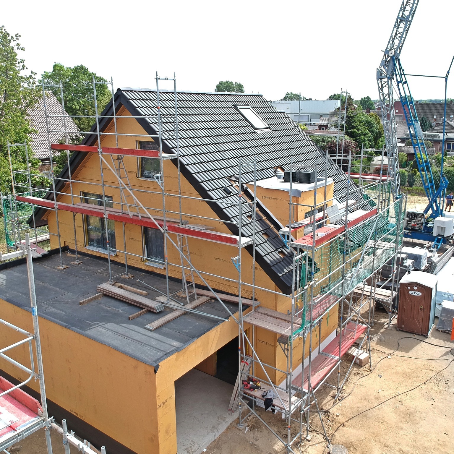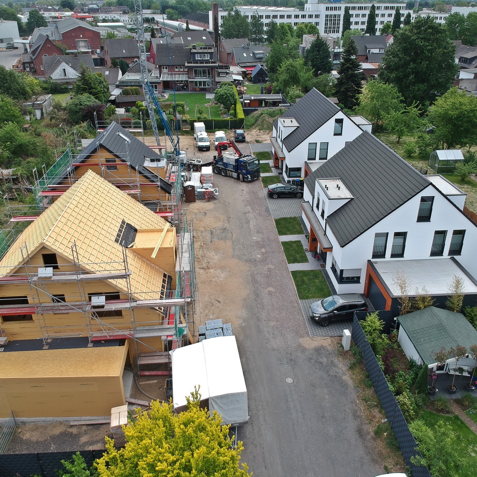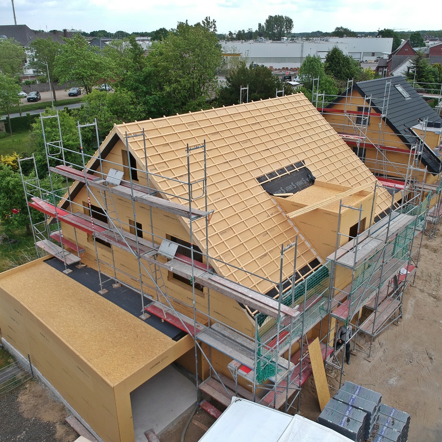 In diesem Baugebiet werden von uns ausschließlich Häuser in ökologischer Holzrahmenbauweise erstellt. Mittlerweile ist das vierte der insgesamt fünf Ein- und Mehrfamilienhäuser aufgestellt.